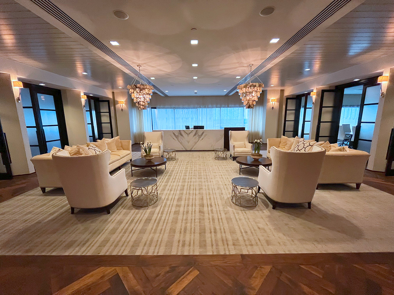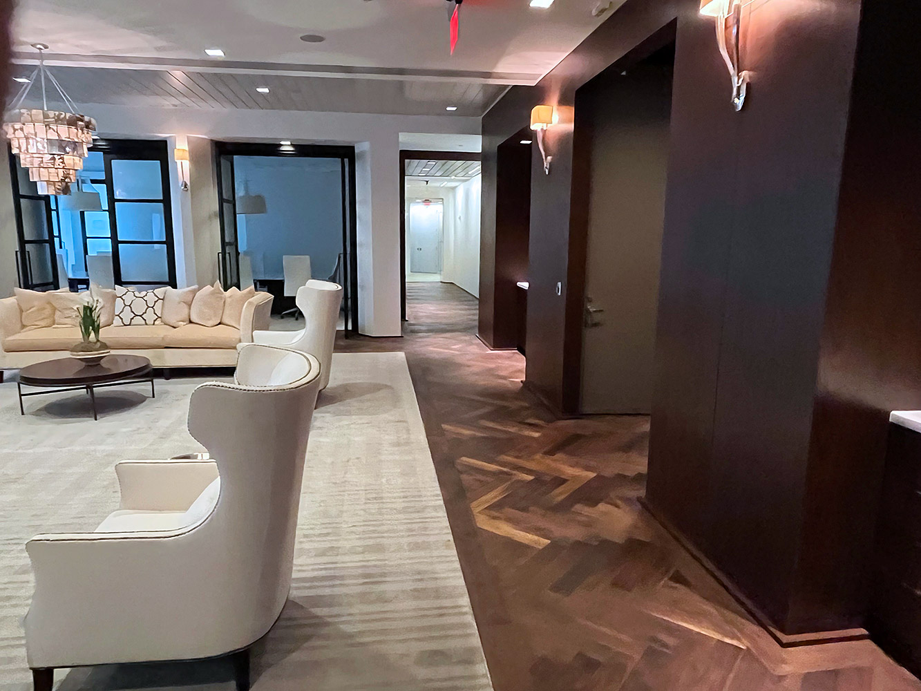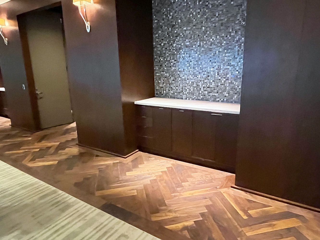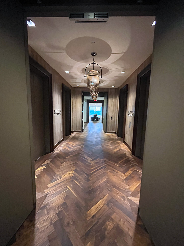 Replacement of Corridor and Conference Room Carpets. Totally Carpets Custom Broadloom was used in the corridors and open office areas. Totally Carpets Custom Broadloom cut and loop in a cross line linear pattern was used in the conference rooms and reception area inset. The Olde Savannah Walnut wood flooring was refinished in an oil rubbed application to restore it back to its original state.